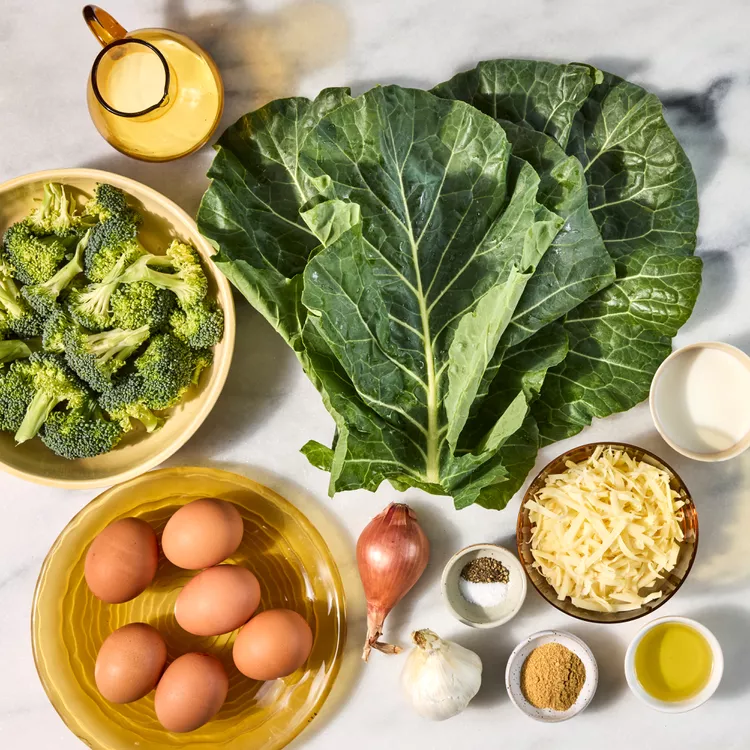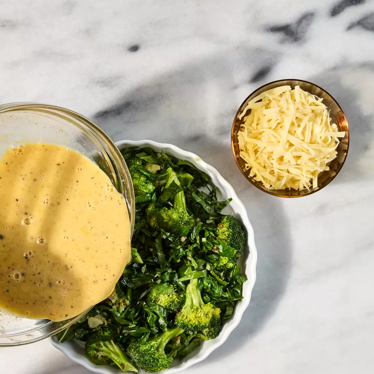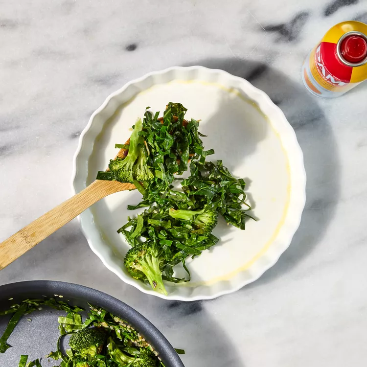 - Cook veggies: Warmth 1 tablespoon oil in a massive nonstick skillet over medium warmness; swirl to coat. Upload 2 tablespoons shallots and 1½ tablespoons garlic; prepare dinner, stirring regularly, until translucent, approximately 1 minute. Add four cups collards and 2 cups broccoli; cook, stirring continuously, until wilted and softened, approximately 4 minutes. Transfer to the prepared pie pan.